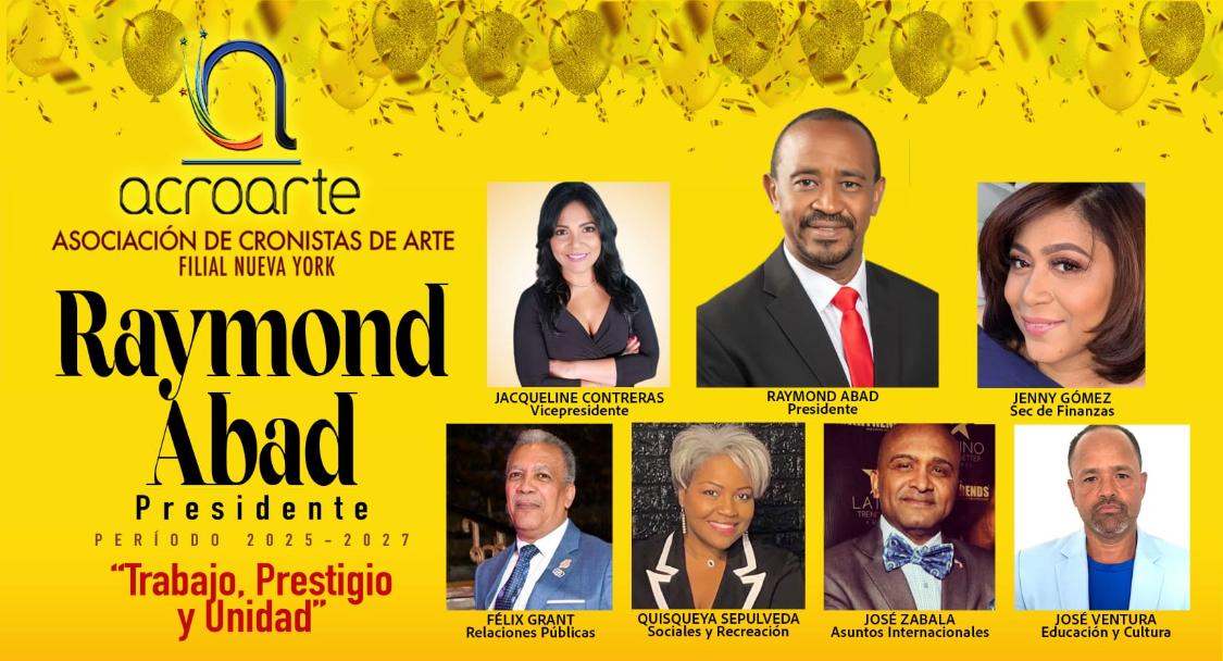Esa noche, asumirá la presidencia de la filial neoyorquina de Acroarte, el comunicador y folclorista Raymond Abad, que encabezará la directiva denominada “Trabajo, Prestigio y Unidad”, ganadora en las pasadas elecciones del mes de junio. La integran además Jacqueline Contreras, Jenny Gómez, Félix Grant, Quisqueya Depulveda, José Zabala y José Ventura.
