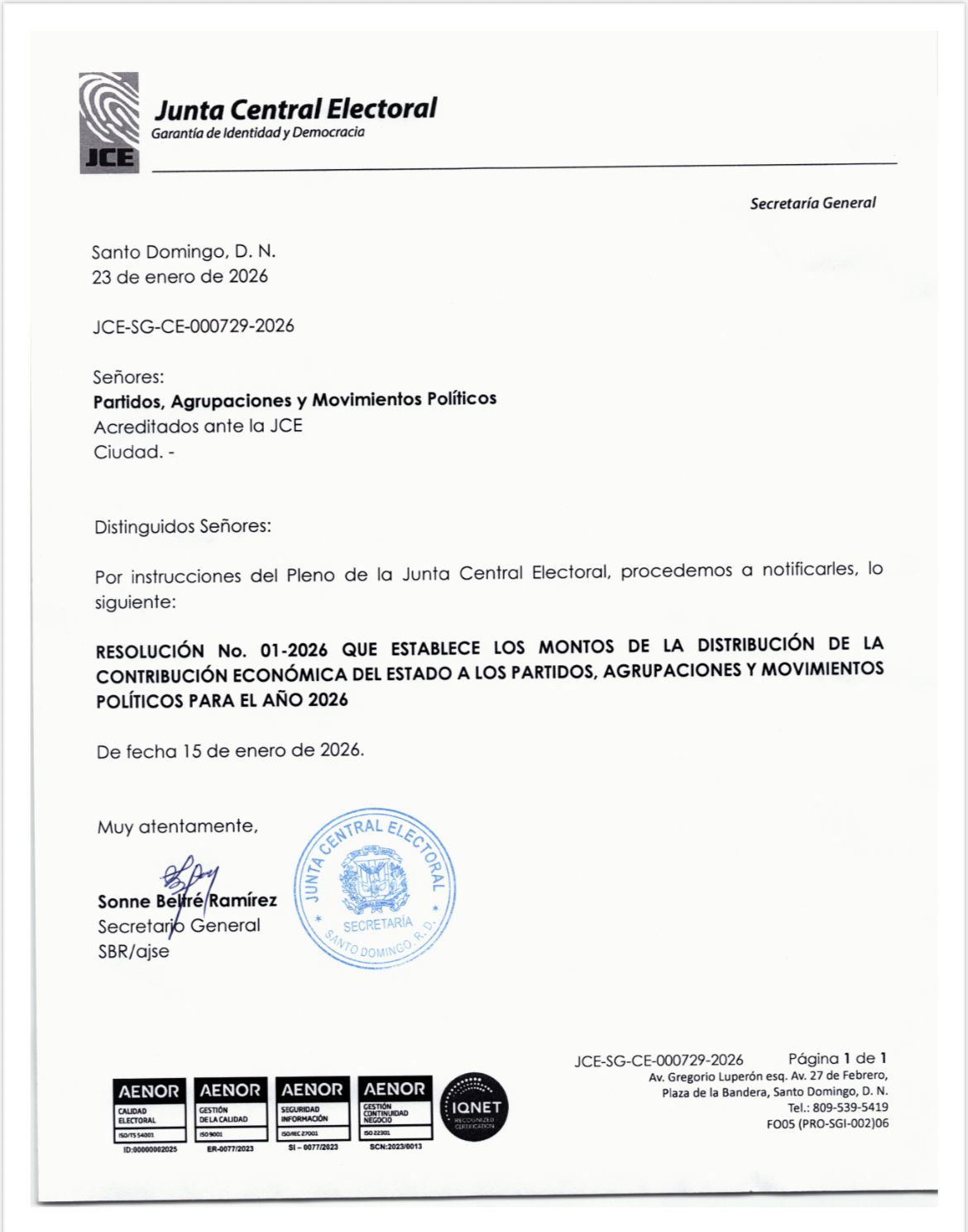 - Casos Especiales: El partido Generación de Servidores (Gens) aprobó formalmente la renuncia a los fondos públicos. Además, se reconoce el cambio de nombre del Partido Socialista Cristiano a Partido Solidario Cristiano (PSC).